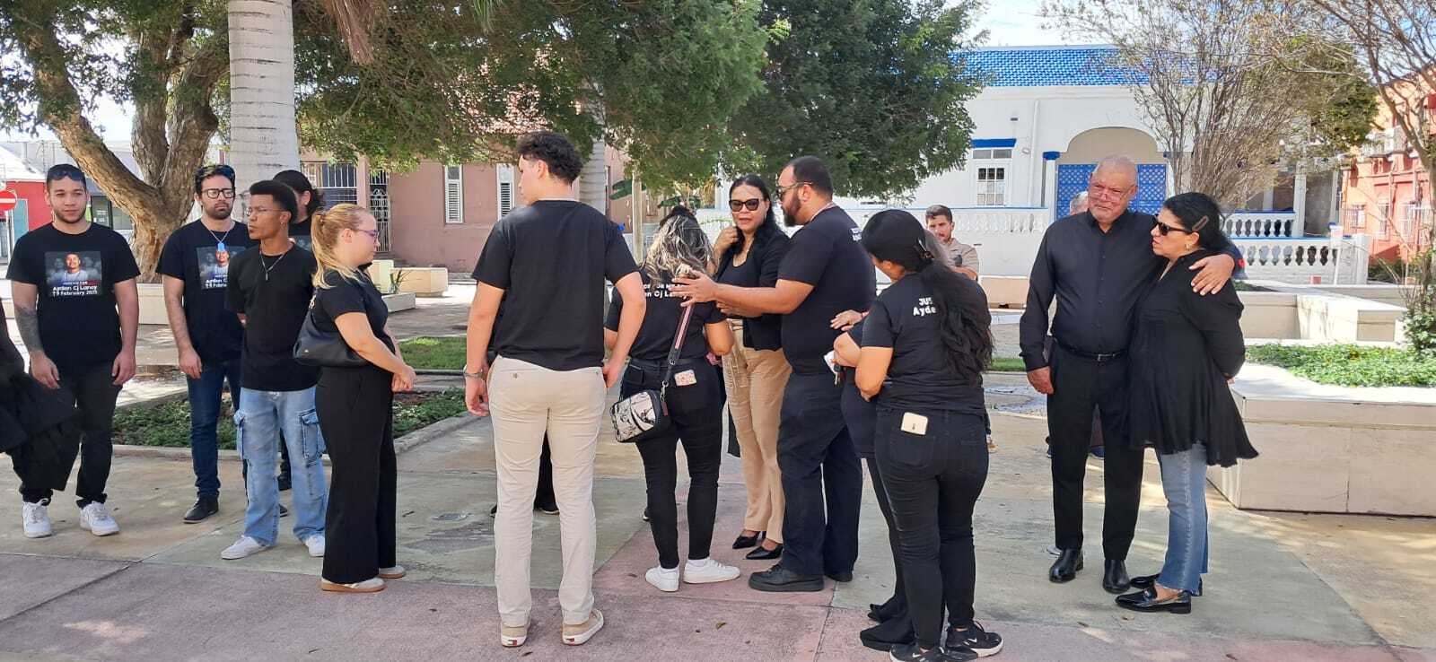 De moeder van Ayden Lanoy samen met familie en vrienden na afloop van de regiezitting
