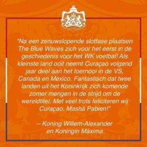 Ook koning Willem-Alexander en koningin Máxima feliciteerden Curaçao: “Fantastisch dat twee landen uit het Koninkrijk zich komende zomer mengen in de strijd om de wereldtitel. Met veel trots feliciteren wij Curaçao. Mashá pabien!”