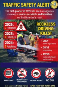 Het Korps Politie Sint Maarten uitte op 21 april zijn ernstige bezorgdheid ‘over het aantal en de ernst van de verkeersongevallen’ die zijn geregistreerd in het eerste kwartaal van 2026. Een analyse uitgevoerd door de Verkeersafdeling wijst uit dat er ‘een aanzienlijke en zorgwekkende toename’ is in de ernst van deze incidenten. In 2024 zijn in totaal vijf verkeersdoden geregistreerd. In 2025 werden drie verkeersdoden geregistreerd. ‘Echter, alleen al in het eerste kwartaal van 2026 zijn reeds zeven verkeersdoden geregistreerd’, zo stelt de politie.